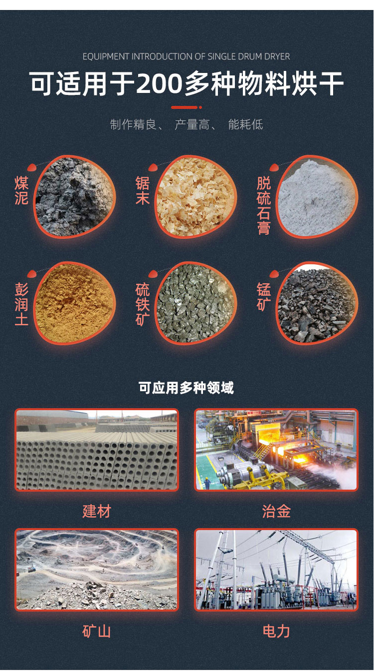 單筒烘干機(jī)系統(tǒng)是由熱源、打散裝置、帶式上料機(jī)、進(jìn)料機(jī)、回轉(zhuǎn)滾筒、帶式出料機(jī)、引風(fēng)機(jī)、卸料器和配電柜構(gòu)成的新型專用干燥設(shè)備,可廣泛應(yīng)用于煤泥、原煤、浮選精煤、混合精煤等煤炭行業(yè)物料的干燥;高爐礦渣、粘土、澎潤(rùn)土、石灰石、沙子、石英石等建筑行業(yè)物料的干燥;各種金屬精礦、廢渣、尾礦等選礦行業(yè)物料的干燥;以及化工行業(yè)非熱敏性物料的干燥。