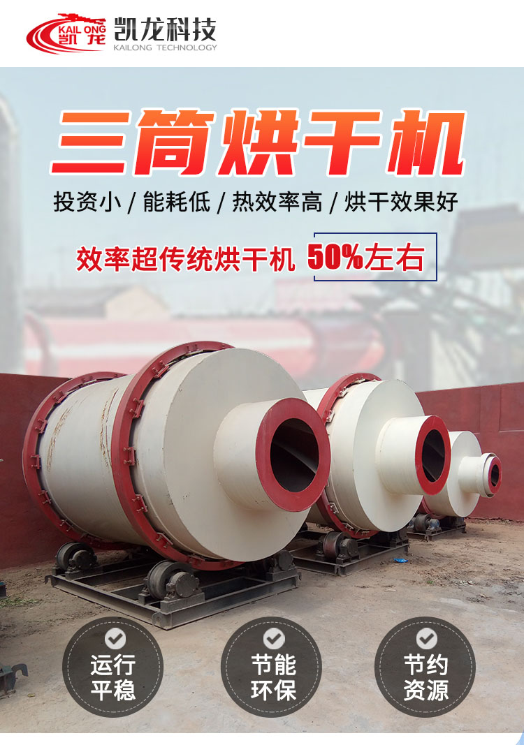 三筒式烘干機具有結構緊湊、構造簡單、布局合理,提高物料與熱能的熱交換率,使物料烘干效果好;基礎投入少,僅是相同產量單筒烘干機的二分之一,減少了一次性投入;運行可靠、能耗低、熱效率高;同時,容易實現自動化控制,減少操作人員,節約勞動力資源。