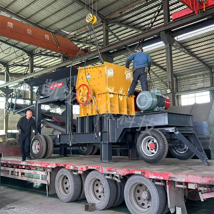 移動箱破機作業時,物料經給料機均勻輸送移動破碎站到破碎機內,經